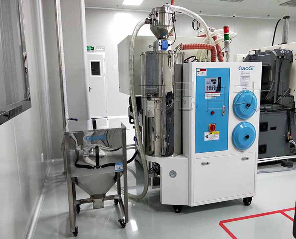 吸料部分:吸料是從儲(chǔ)料桶或其他儲(chǔ)料容器中吸入干燥料桶內(nèi),當(dāng)真空料斗的磁簧開(kāi)關(guān)偵測(cè)到無(wú)料時(shí),吸料馬達(dá)運(yùn)轉(zhuǎn),使真空料斗內(nèi)產(chǎn)生真空,儲(chǔ)料桶中的原料由于空氣的壓力差被吸入真空料斗內(nèi),當(dāng)吸料時(shí)間完成后,吸料馬達(dá)停止運(yùn)轉(zhuǎn),原料會(huì)因自重落入干燥桶內(nèi)。經(jīng)干燥后的原料從干燥料桶抽到安裝在塑膠成型機(jī)的電眼料斗內(nèi)或其他料斗內(nèi)。